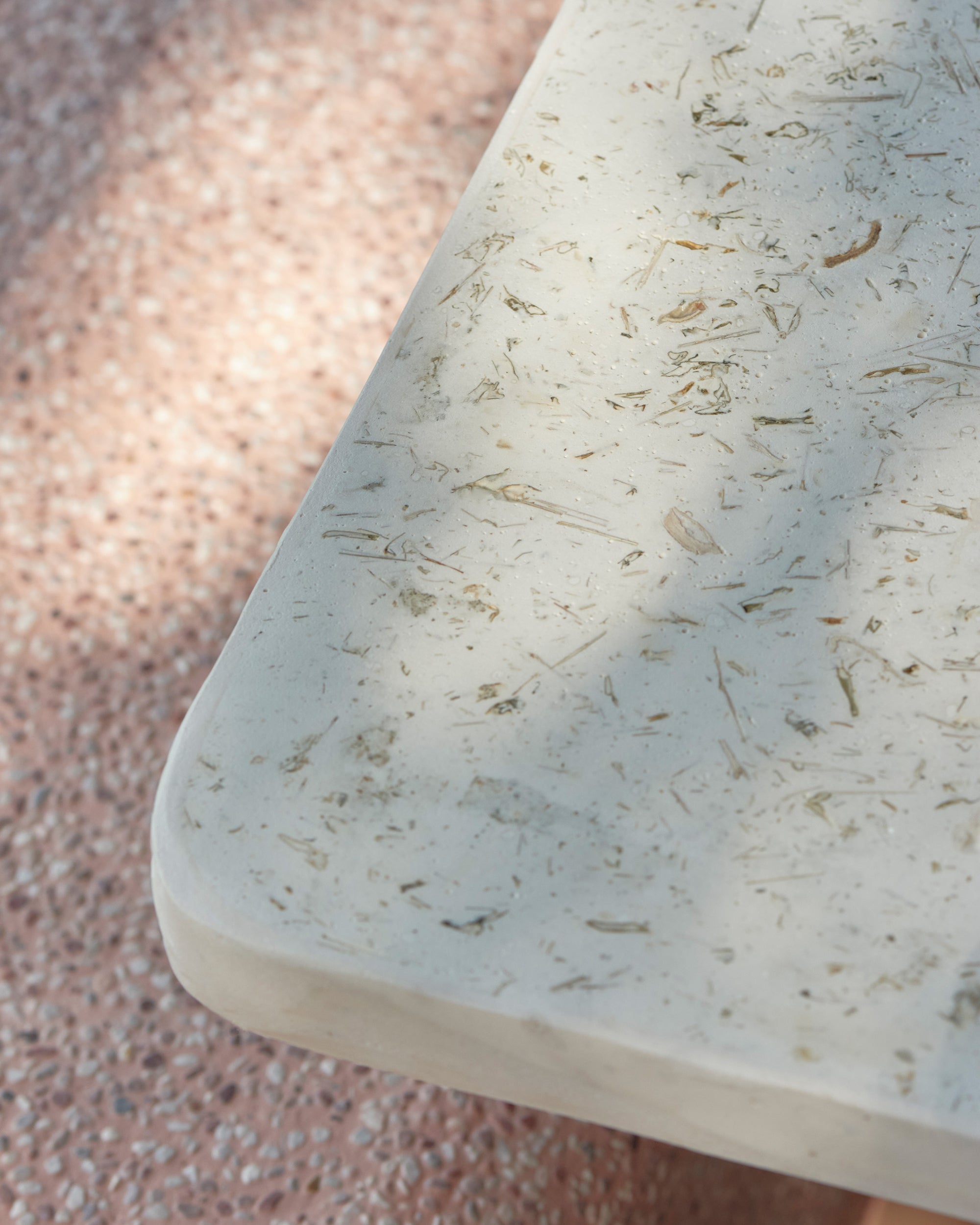 We’ve transformed botanical waste, such as chrysanthemum, lemon, cucumber, lemongrass, and recovered wood pallets, into a unique, upcycled table top material. This innovative approach opens up new possibilities for the future of design.